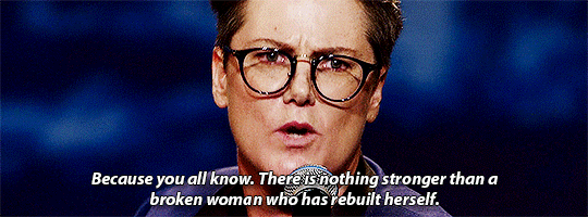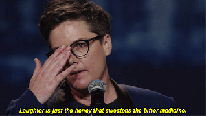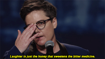 La comedia, según sus palabras, se trata de una introducción y un remate, se tiene que hacer tensar al público y luego relajarlos con un remate que les produzca esa risa, y liberen por ende la tensión que Hannah Gadsby crea en nosotros. Palabras más, palabras menos, eso es lo que nos da a entender. Los ejemplos varían mucho, como por ejemplo ella se hizo comediante porque hacía muchos chistes respecto a cómo salió del clóset ante su madre –Ay hija, no me digas esas cosas, es como si yo te dijera que soy una asesina serial- porque es OBVIO que podemos comparar el decirle a tu madre que eres homosexual a confesar que eres un asesino serial (espero se note el tono de ironía en mis letras y si no, lo claro de una vez: estoy siendo sarcástica).